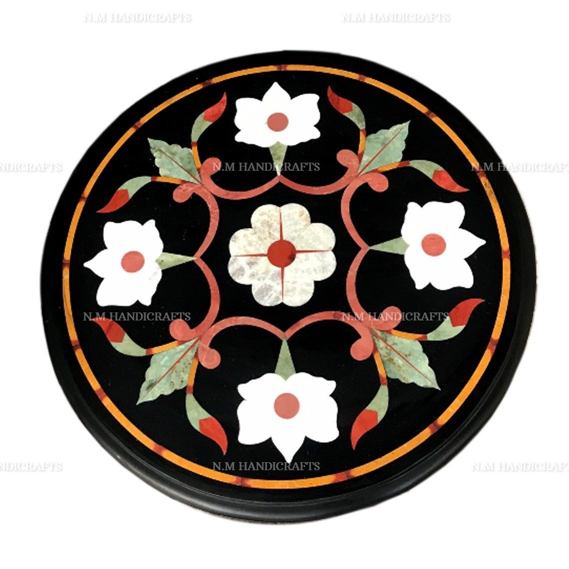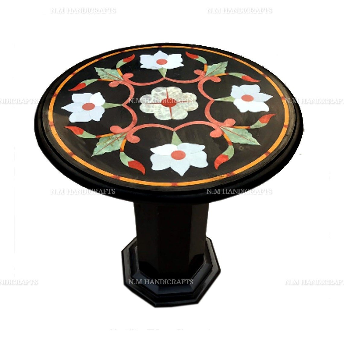 Round Black Marble Coffee Table, Vintage Table Top, Gems Stone Inlay, Living Room Furniture, Side & End Table, Center Table, Dining Table
