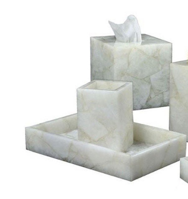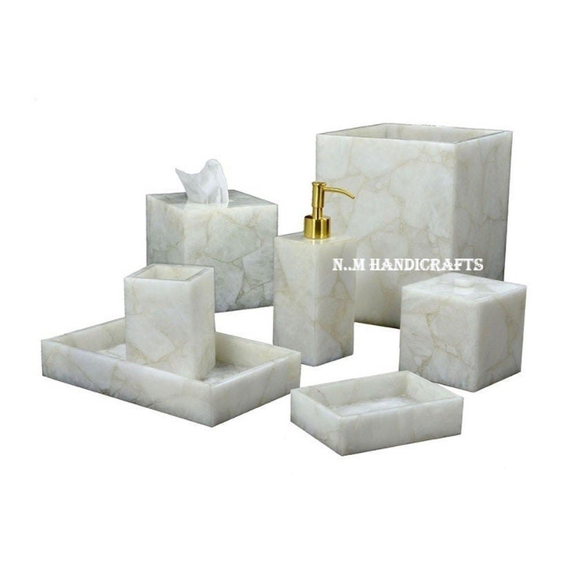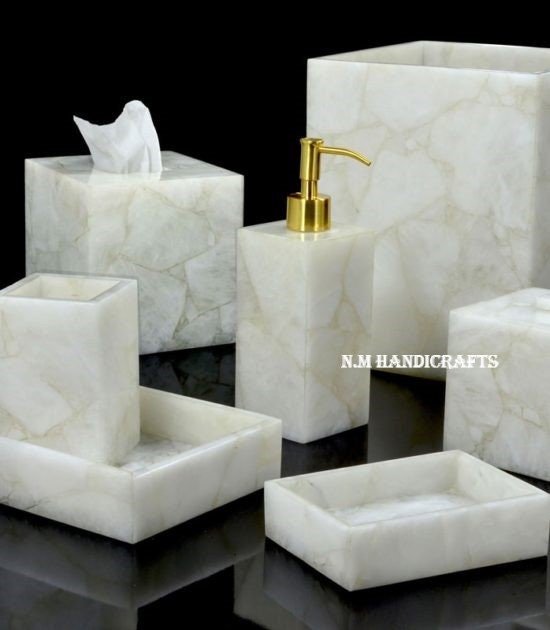 Décor your bathroom in our luxury home Gem stone Accessories Collection. Quartz bathroom set is handcrafted from handpicked Indian Quartz Gems Stone and its hand crafted by skilled artisan’s in house factory in AGRA .Each piece will feature unique natural stone variations.